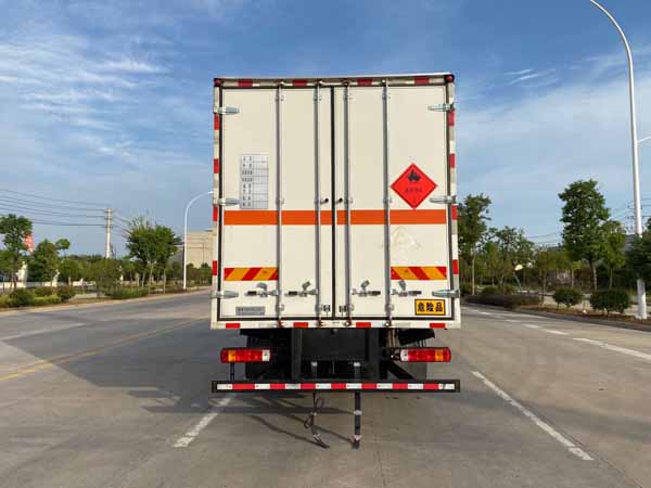 廂體配置:嚴格按照公告尺寸制作。外板采用優質冷軋鋼板帶百葉窗,內飾為導電性能良好的鋁平板有透氣孔,矩形骨架結構內部填充防潮阻燃擠朔板,復合加鉚合工藝。廂體四周鋁合金包邊及包角,車廂底板鋪設防靜電膠皮,廂體前臉50公分高鋪設防靜電膠皮。后部設置對開門,可選裝側門位置,廂體內部兩側安裝捆綁貨物的臥環。廂體內部安裝氣體器及感應防器及防盜報警器。車廂一周粘貼橙色放光帶,箱體粘貼 菱形告示牌,安全告示牌,危險品牌,箱體安裝示廓燈(前白后紅),拖地靜電帶。