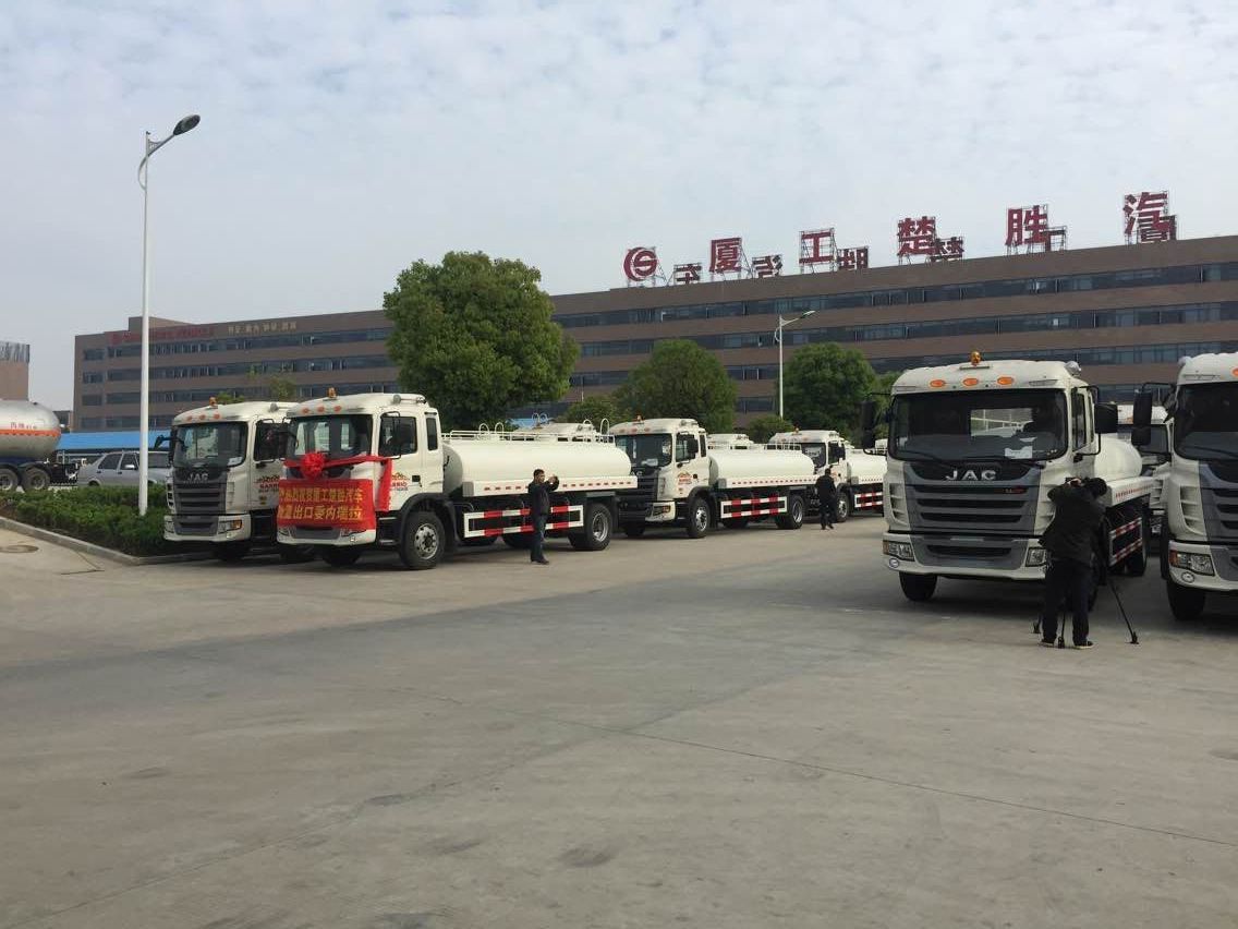 2015年4月24日,在湖北隨州廈工楚勝公司辦公樓前50輛運水車整裝待發(fā),準備出口到委內瑞拉。