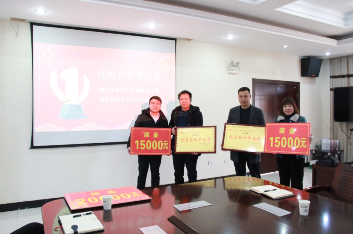 會上公司對2021年先進專業廠進行了表彰:“突出貢獻獎”1名,獎金30000元;“科技創新獎”1名,獎金20000元;“優秀合作單位獎”2名,獎金15000元。財務總監陳擁軍、副總裁田飛、副總裁殷斌和部長江潔分別為以上獲獎單位頒獎。