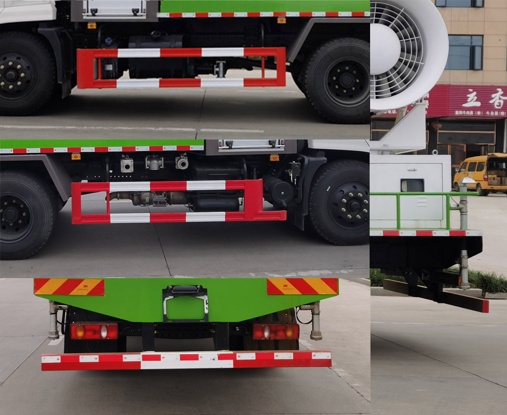 配置  1、該車主要用于城市街道的噴霧抑塵,主要專用裝置為噴霧總成。罐體有效容積:7.35立方米,罐體外形尺寸(長×寬×高)(mm): 2850×2500×1500。2、側、后防護材料均為Q235,螺栓連接,后防護截面尺寸(mm)120×60,下邊緣離地高450mm。3、僅選用3950mm軸距。隨底盤選裝駕駛室。ABS型號/生產廠家:3631010-C2000/東科克諾爾商用車制動系統(十堰)有限公司,ABS 8/東科克諾爾商用車制動系統(十堰)有限公司,4460046450/威伯科汽車**系統(**)有限公司。