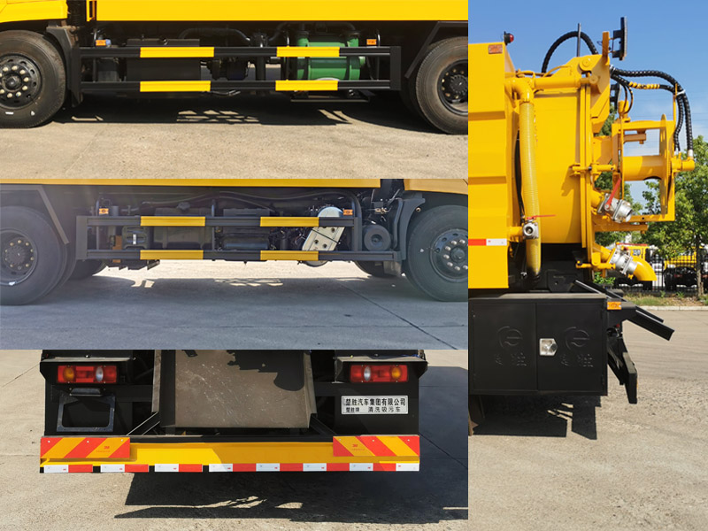 其它:該車主要用于下水道清洗及吸污,主要專用裝置為罐體、吸污泵、清洗沖刷裝置.圓形罐體外形尺寸:罐體總長度5200mm,其中直段長×直徑(mm):4900×1650;罐體前段為清水罐(總長1400mm,其中直段長1100mm),后段為污水罐(總長3800mm).圓形罐體兩側各有一個異型罐,左右對稱,均為清水罐,單側異型罐罐體截面為圓弧及多邊形組成,單側異型罐外形尺寸(長×最大截面寬×最大截面高)為:3500mm×640mm×1100mm.清水罐和吸污罐為兩個獨立罐體,清洗功能時用清水罐,吸污功能時用吸污罐,兩個罐體不能同時滿載,兩種功能不能同時使用.清水罐總容量6.09立方米,有效容積5.8立方米,污水罐總容量7.61立方米,有效容積7.25立方米,側、后防護材料均為Q235,側防護螺栓連接,后防護焊接,截面尺寸(mm)220×50,下邊緣離地高420mm.僅選用底盤4700mm軸距改裝.隨底盤選裝限速裝置,限速89km/h.ABS型號/廠家:3631010-C2000/東科克諾爾商用車制動系統(十堰)有限公司,ABS 8/東科克諾爾商用車制動系統(十堰)有限公司, 4460046450/威伯科汽車控制系統(中國)有限公司,J ABS/焦作博瑞克控制技術有限公司.隨底盤選裝駕駛室.