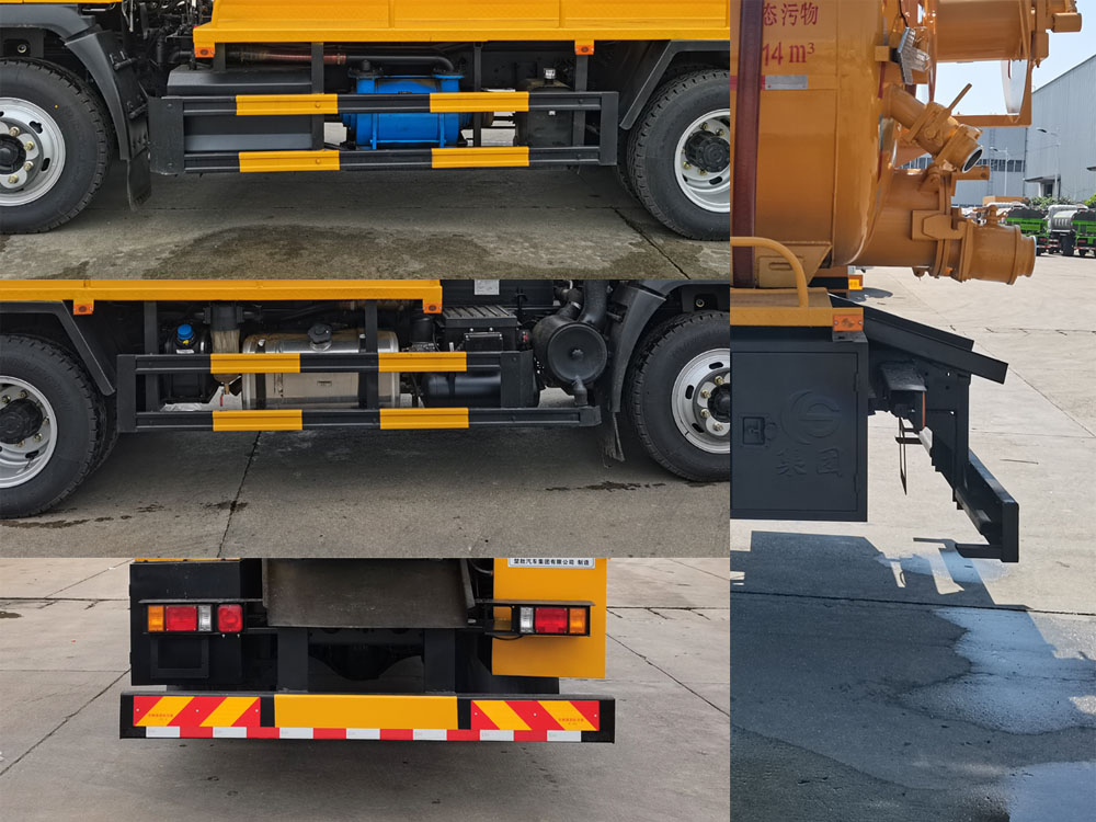 其它:該車用于下水道疏通清洗及吸污并具有舉升功能,主要專用裝置:罐體和清洗吸污裝置。罐體外形尺寸(總長×直徑)(mm):4950×1800,其中罐體前段1550mm為清水罐,清水罐總?cè)萘?.2立方米,有效容積3.18立方米; 罐體后段3400mm為污水罐,污水罐總?cè)萘?.14立方米,有效容積8.13立方米;清洗、吸污兩種功能不能同時使用,兩個罐體不能同時滿載。側(cè)、后防護材料均采用Q235,側(cè)防護螺栓連接,后防護焊接,后防護截面尺寸(mm):200×60,離地高420mm。ABS型號/廠家:CM3XL-4S/3M(4SF)/廣州瑞立科密汽車電子股份有限公司,XH-KQ4S3M-E01/廣州市西合汽車電子裝備有限公司。僅選用3900mm軸距底盤,隨底盤選裝駕駛室。